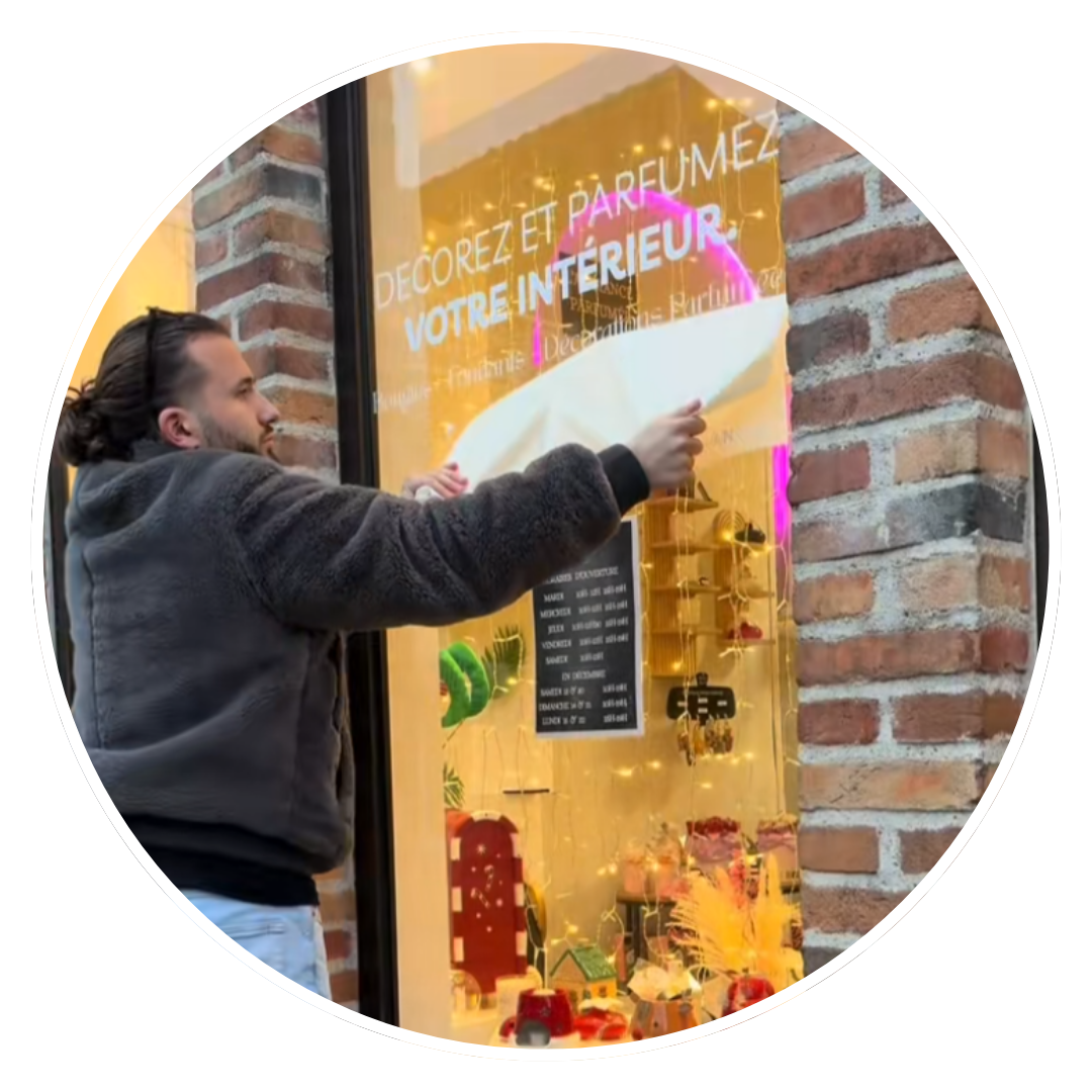 Des adhésifs personnalisés, résistants et précis pour habiller vitrines, véhicules et supports divers.
